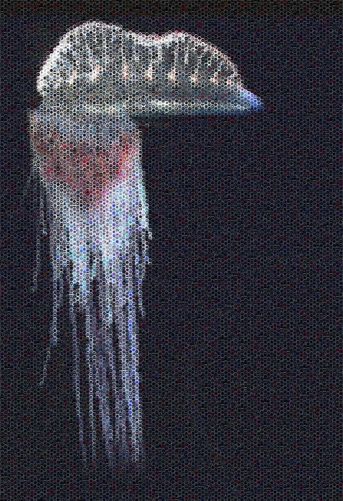 Marine biologists will undoubtedly recognise this image as a Portuguese man o war (Physalia physalis). They would also know that this is a species of siphonophore; an interesting group of animals in that each is in fact a colony of individual zooids, which are genetically identical clones that work together as parts of the siphonophore to perform different functions. Mummery recognised the potential that siphonophores provide being, as they are, a colony of individuals adrift on the high seas that are connected by a nerve net, but with no central brain to guide the animal’s behaviour. The sophistication of Mummery’s poster, however, can be seen when we look closely at the individual ‘cells’ that make up the image of the Portuguese man o war. For these individuals are not zooids as one might expect, but social media profile pictures and avatars of the people in her social network. What we have then is a siphonophore made out of members of a social network. This clash of seemingly incongruous things, is attention grabbing and makes one question why this association has been made.