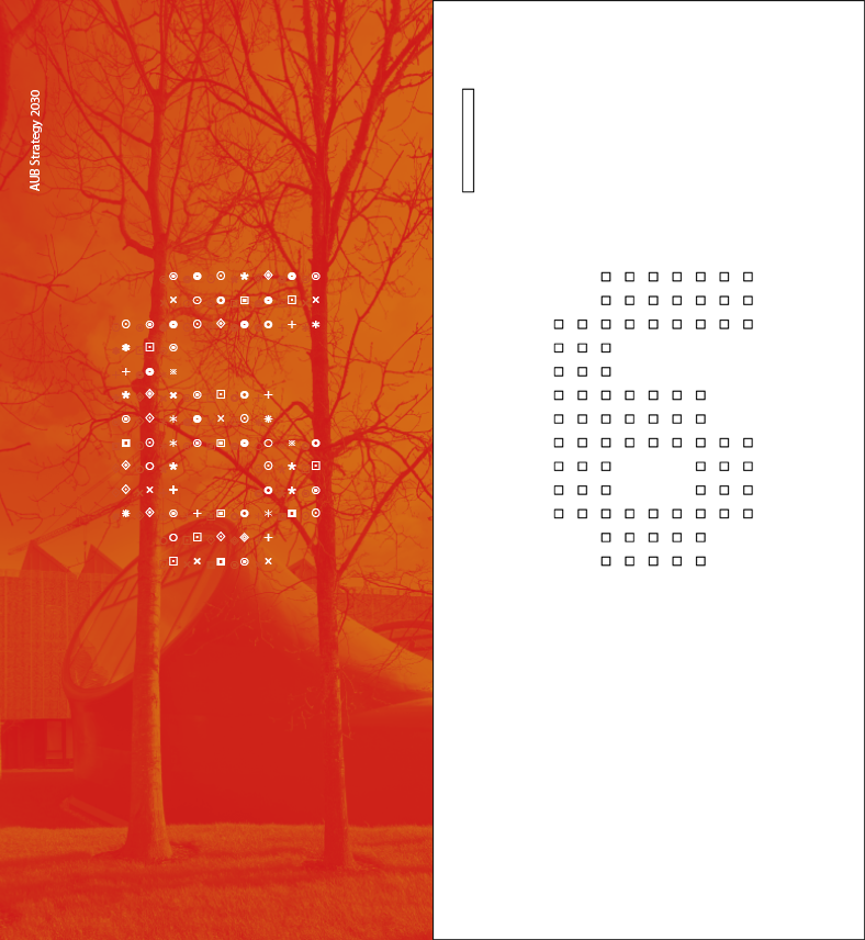 The image (above left), is a page from the AUB Strategy 2030, and the ‘6’ in the centre of the image relates to the six operational plans that form part of this strategy. The assortment of various glyphs from which the ‘6’ is made indicate little more than points in space. The dots, asterisks, or whatever, draw our attention to the spatial location at which the dot or asterisk appears. They do not seem representative of much to do with operational plans or even the number ‘6’. In this sense they are comparable to thinking about a Lego brick as a neutral component that basically stands for itself. These glyphs may be separated, but because the spacing of the glyphs is structured and coordinated according to a predetermined framework it is relatively easy to pick out the ‘6’ (above right). This could be interpreted as a simple decorative way of presenting the number 6—numbers were, after all, something of a theme that ran through the document. But there was an intention at least, to suggest a level of correspondence with respect to planning. A plan requires different actions (parts of the plan) to be synchronised and aligned to achieve a greater outcome. The depiction of the ‘6’ requires users to recognise how different elements combine to form a greater whole. And the placement of each of these contributing elements is also part of a plan (in the sense of an architectural plan) or grid that determines their positioning. It is easy to over-think this of course, and I suspect that this design would not motivate most users to invest the attention and effort necessary to see meaning potential beyond the slightly unusual depiction of a six. Furthermore, even if users recognise the correspondence between different stages of a plan and different parts of a letterform, this does not provide us with the same rich possibilities in terms of new emergent meaning, that, for example, Mummery’s project evokes. In other words, the building blocks of the ‘6’, because they represent very little, do not challenge us to make creative associations with the ways that different action points come together to make a larger plan.