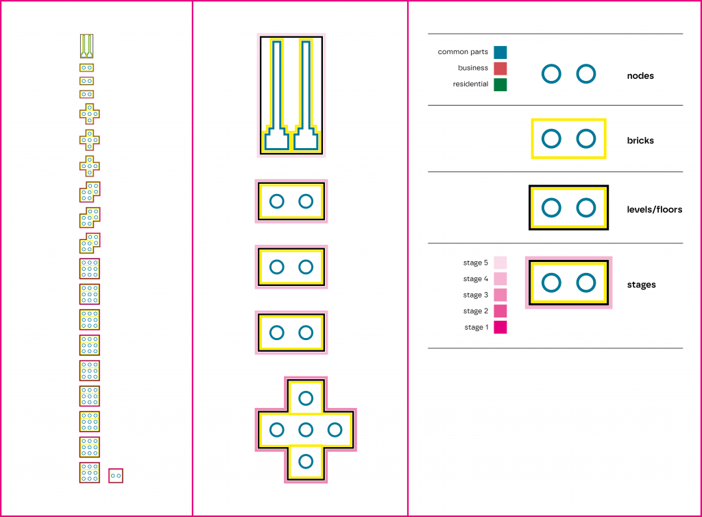 The diagram above shows a diagram based on one of the photographs in an earlier section of the essay. The left panel shows a diagram of the whole tower, the central panel is a detail of this diagram, and the right panel is a key showing how the diagram is structured. The first row of the key shows how the nodes of the Lego bricks are represented. Each node can be coloured differently in one of three ways according to how we might envisage this area of model being set aside for either business, residential or common parts/services. The next row of the key shows how the yellow rectangle identifies the size of Lego brick used, the size of bricks used in the model can range from accommodating one node, to six nodes. The next row in the key uses a black outline to show how bricks can combine to form levels in the building, in the key there is just one brick on this level but a level could be made from multiple bricks. The final row in the key uses a magenta outline to show the stages in the tower. For example levels one to nine share the same layout of bricks and these nine floors make up stage one of the model. Altogether there are five stages in the tower so the magenta outline in the key has five different tints of magenta that can be utilised, one tint for each stage in the tower.